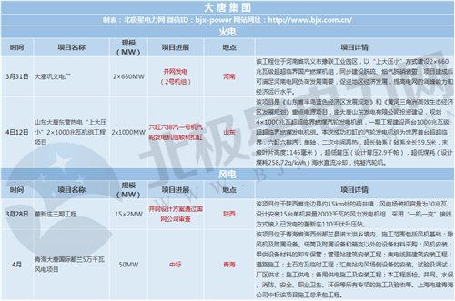 大唐集团涉及项目动态4个,其中火电、风电项目各2个;